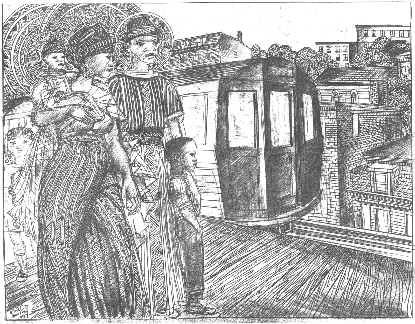 Image: Allan Rohan Crite, Madonna of the Subway - family and train front March 1987. Multilith print. 11 x 17 in. Tufts University Permanent Collection: Gallery Purchase. Photographic scan by Sarah Gurney.